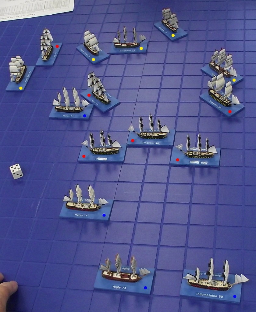 Previous Image Next Image DSCF0009 As the Temeraire engages several allied ships, the two following British 74s weave through the Spanish ships. Red dots have been added to indicate British ships.