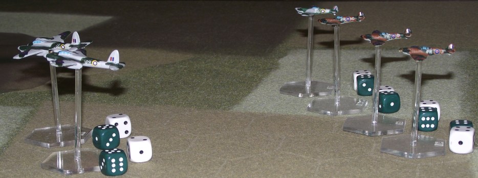 Spitfires provide close support to the Mosquitoes.