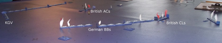 Next Image DSCF0015t The older ships at the rear rear of the German line suffer under the guns of the leading British battleships. British armoured cruisers are shattered and British light cruisers pass down the German battleline.