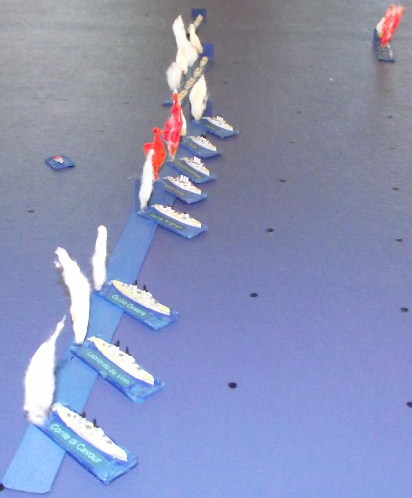 Previous Image Next Image DSCF0008 The Italian battle line evades a torpedo attack by a turn together. One dreadnought has sunk.