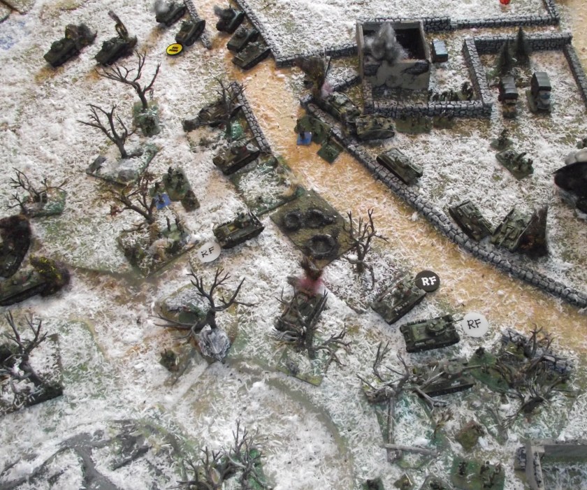 The first defense line (StuGs and infantry) is taken.