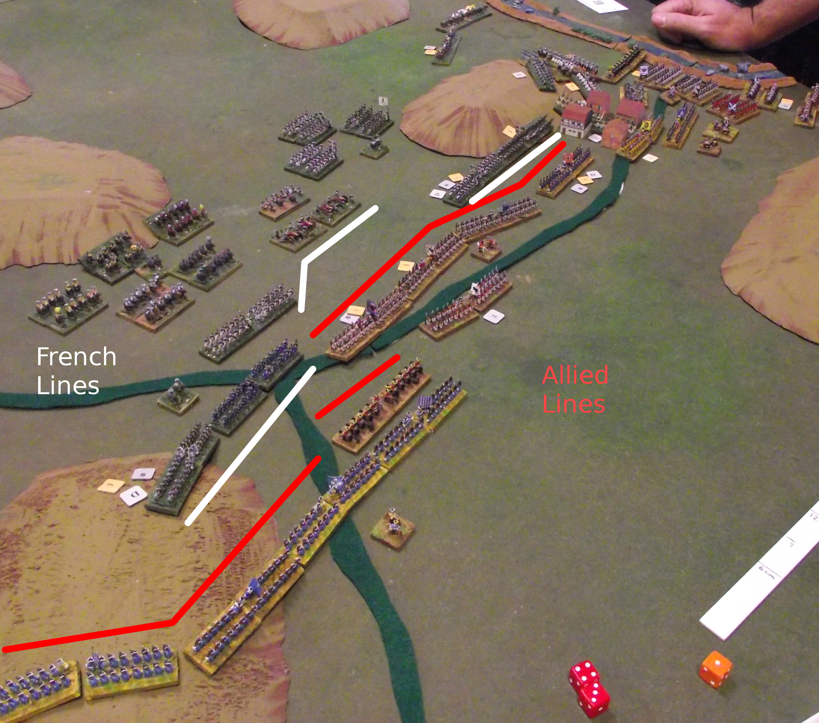 Next Image DSCF0027c Most of both armies deployed. The French have a cavalry reserve in the center. The Allies have uncommitted infantry on the far right.