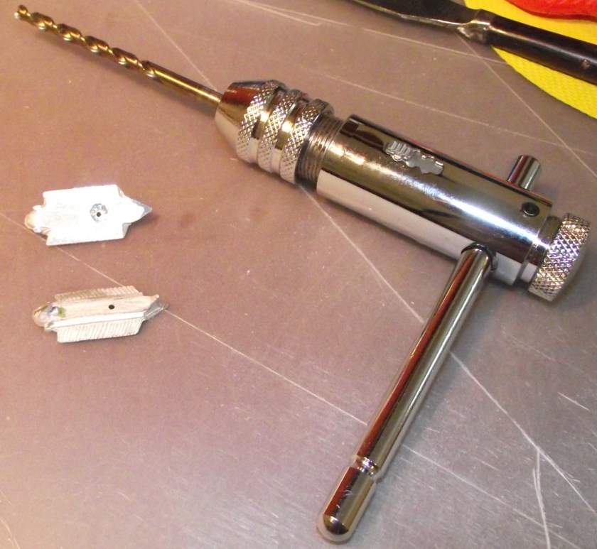 Tap wrench used as a large pin vice to drill holes for magnets.