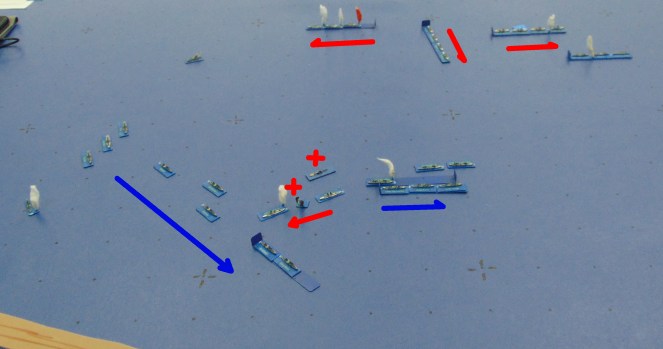 Previous Image Next Image DSC01126c The British dreadnought division passes through the French fleet. One collision occurs. The Bellerophon blows up and the Temeraire sinks.