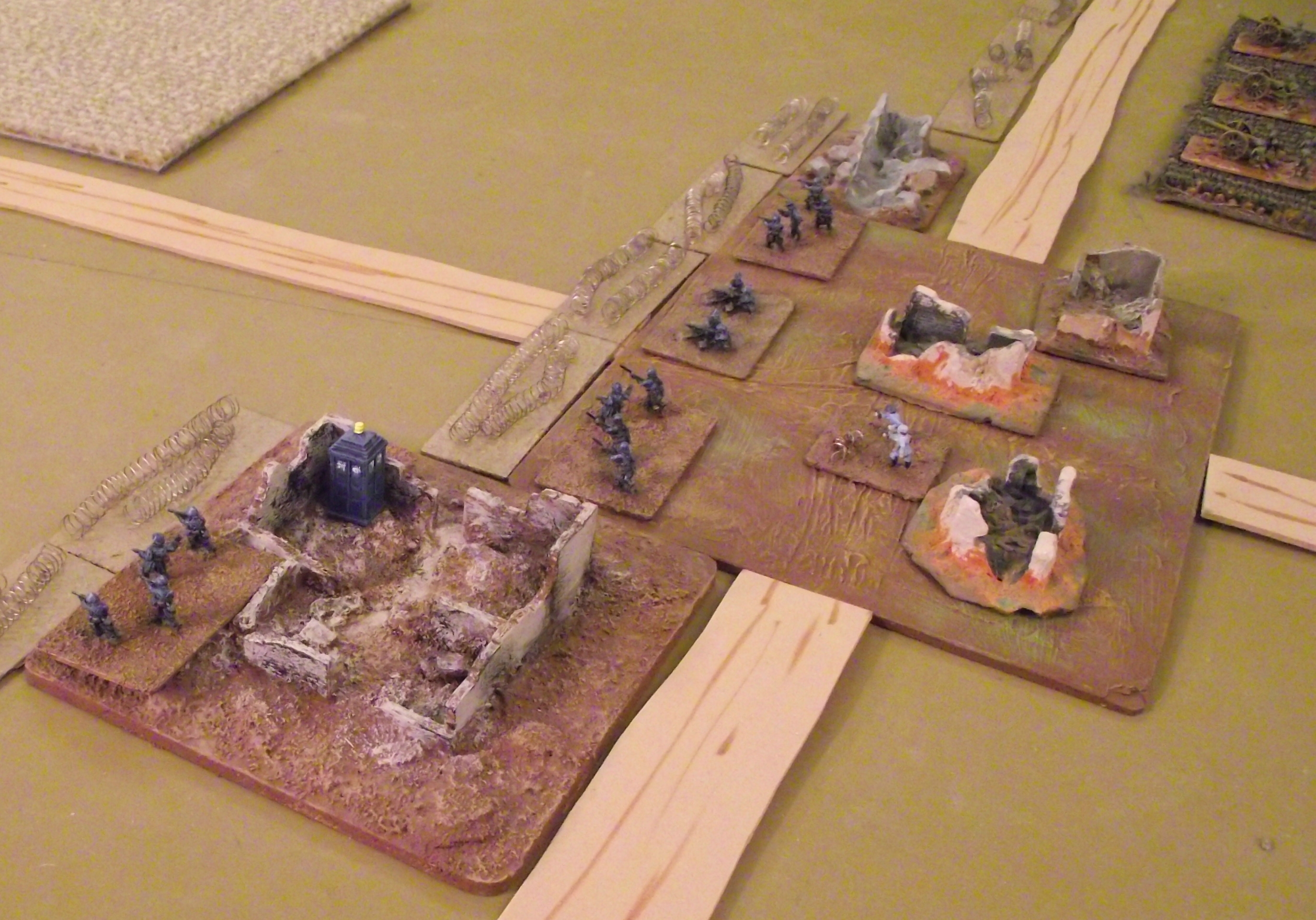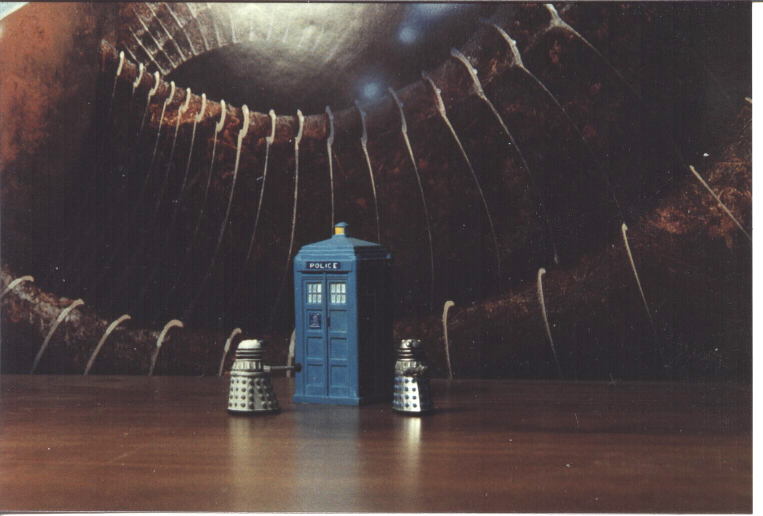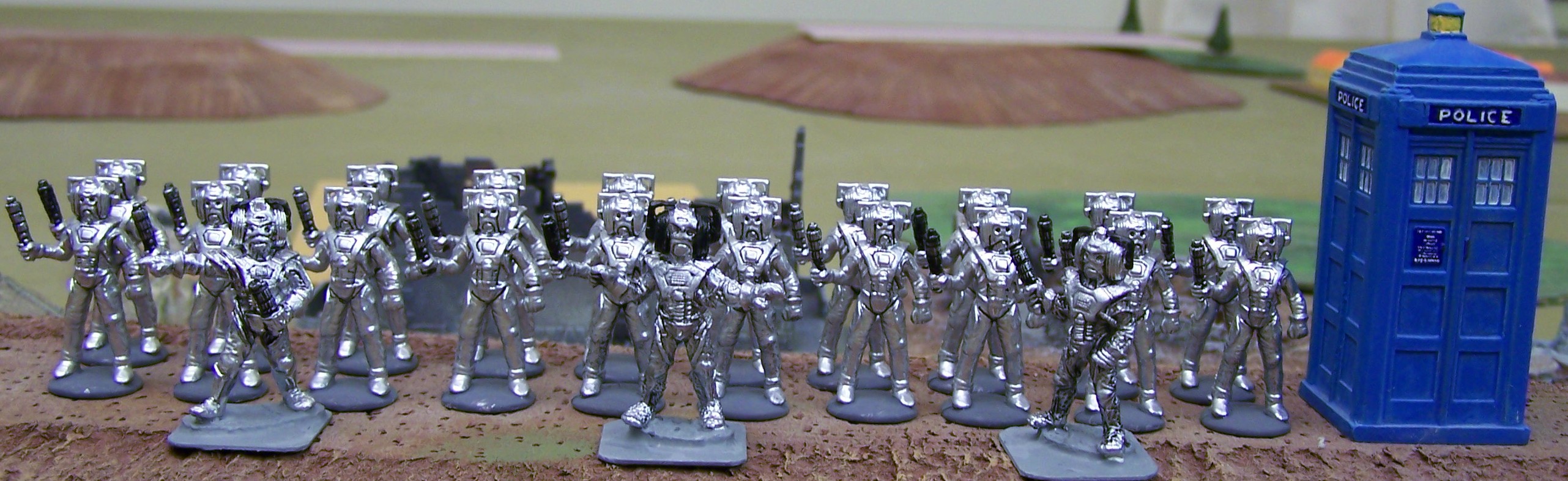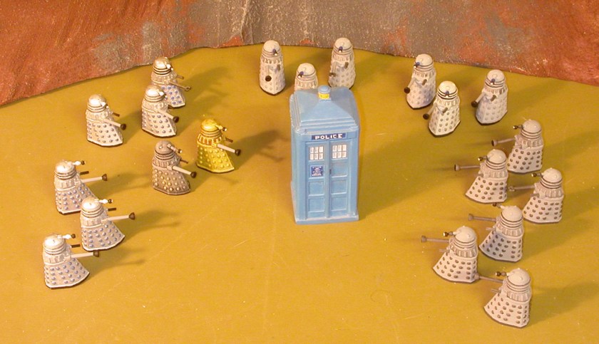 My Daleks and most of the Cybermen are plastic models sold in a box set many decades ago. Three ‘leader’ Cybermen are lead figures from a RAFM line also sold long ago (at least in my time-line). I don’t remember where my 25mm TARDIS came from, but British police boxes have been made in several scales by British railroad model companies. I have one in N-scale I use with my 10mm figures.